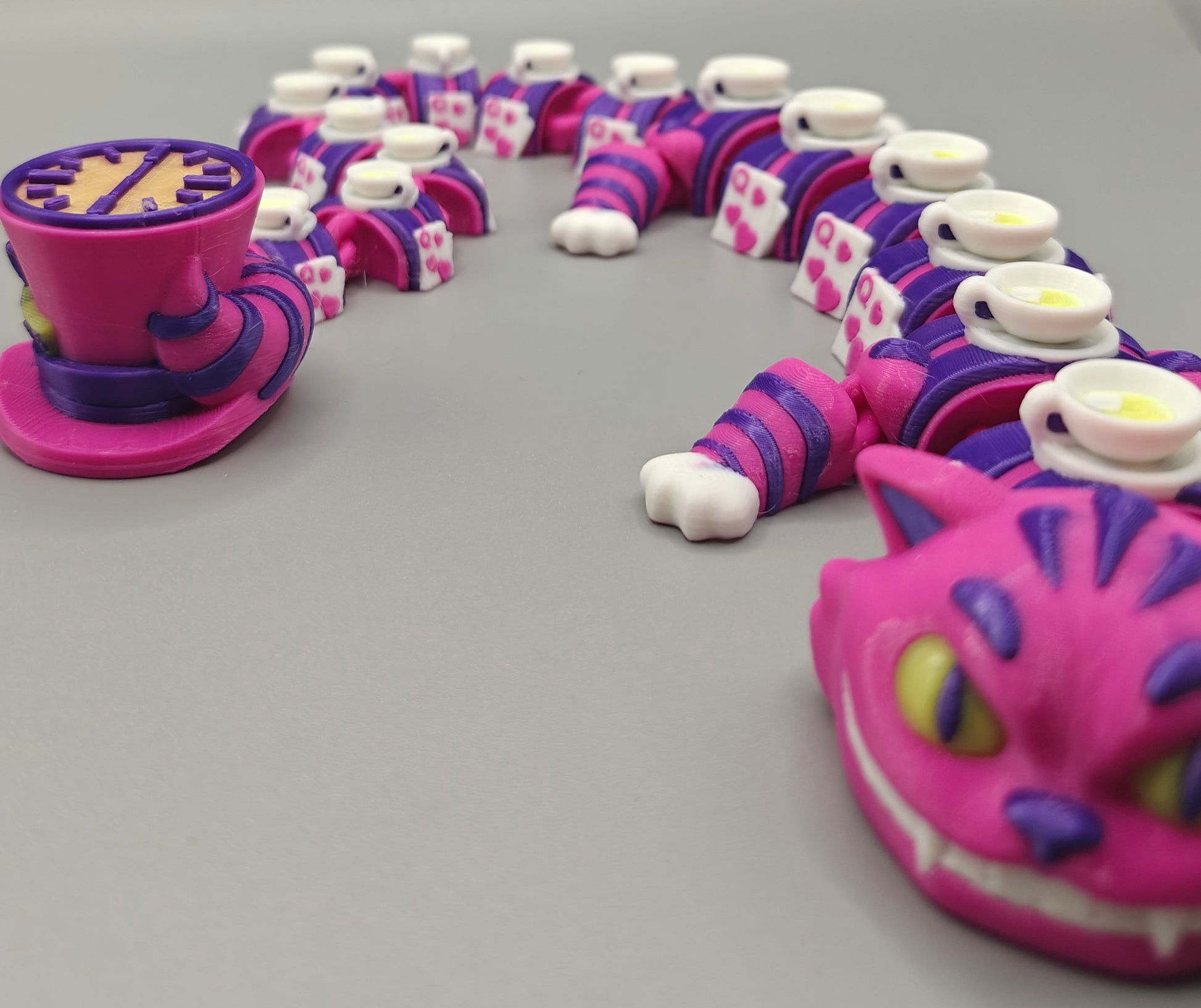 Fall down the rabbit hole with this Cheshire Cat Dragon — a playful fusion of fantasy and whimsy inspired by classic Wonderland-style charm. Featuring a wide mischievous grin, vibrant colors, and a fully articulated body, this dragon is bursting with personality from head to tail.