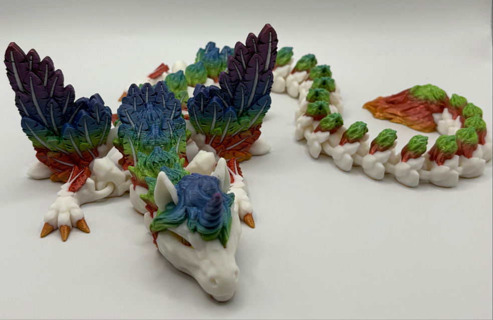 Bring a burst of color and magic into your collection with this Articulated Rainbow Feather Dragon. With its flowing body, feathered scales, and shimmering rainbow tones, this dragon is both a majestic display piece and a fun, flexible fidget toy.
