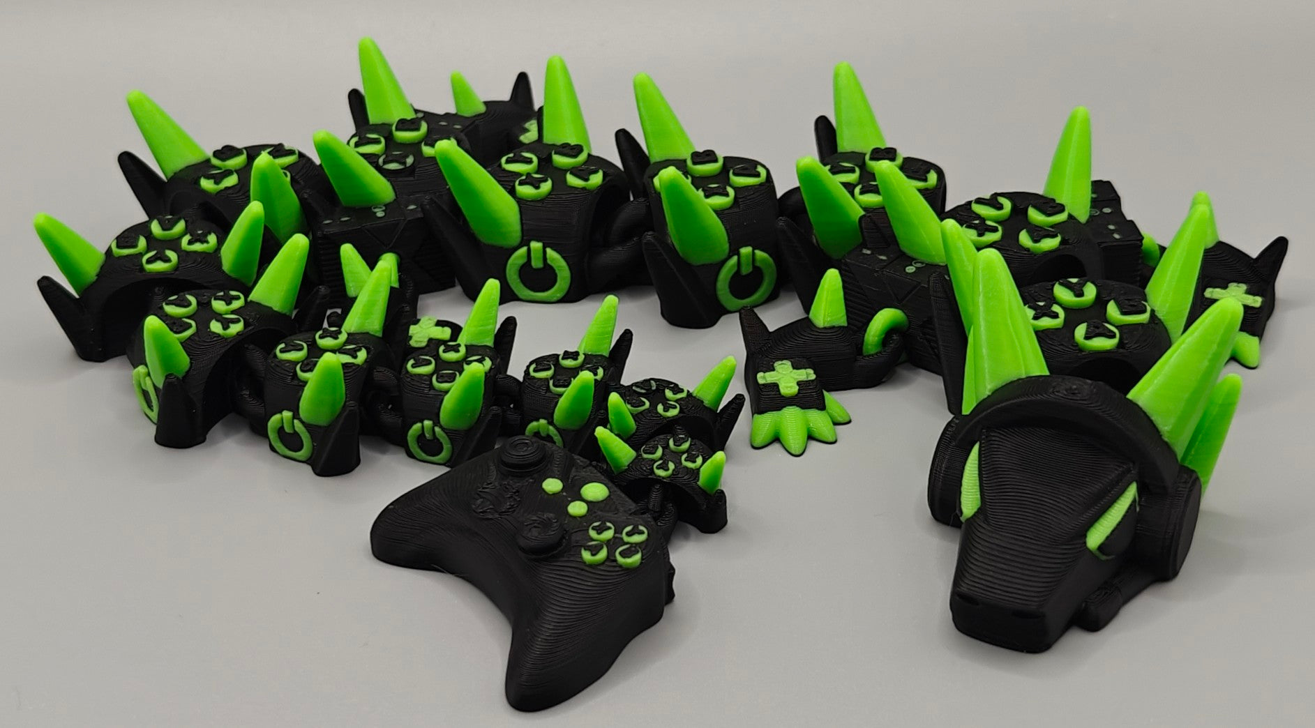The dragon features a fully articulated, flexi body that moves smoothly from head to tail, making it incredibly fun to pose and fidget with. The bright green spikes, accents, and controller-inspired details give this dragon a futuristic, high-energy look that instantly stands out on any desk or shelf.